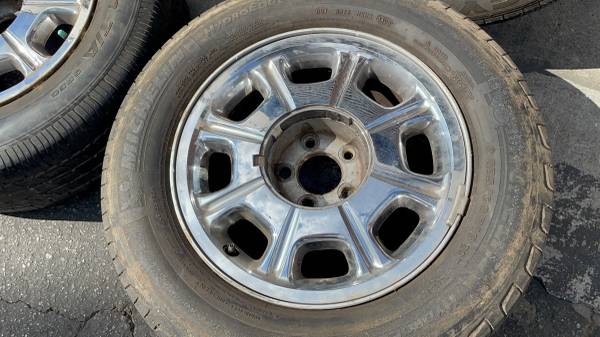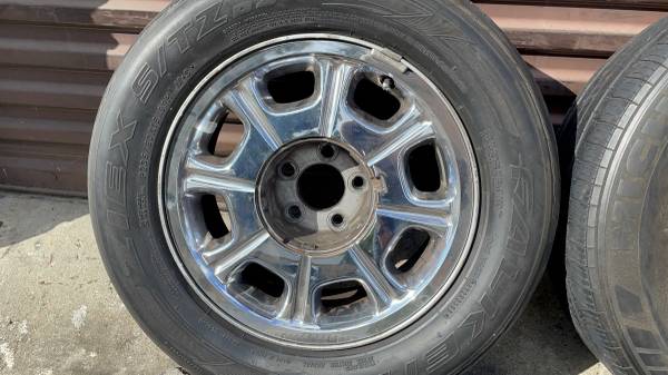 This is a set of four 16x7 inch factory original chrome clad aluminum wheels from a Lincoln Town Car. The lug pattern is 5 on 4.5 inches. They also fit on a Mercury Grand Marquis and on Ford Crown Victoria, which has exactly the same suspension; they fit on a few other classic Ford Lincoln Mercury cars as well. They also fit on Toyota pickup trucks and a few other vehicles with this lug pattern.All four rims are in good condition they have some little scratches but no bends or cracks, no major damage on any of them. I don't have the center caps and the tires are old and need to be changed. They hold air if you just need rollers or burners, but I wouldn't drive on them. Perfect for any daily driver, project, or commuter.