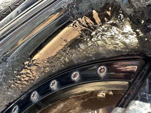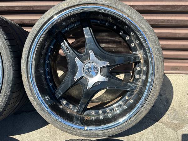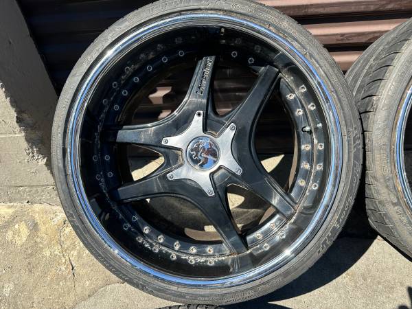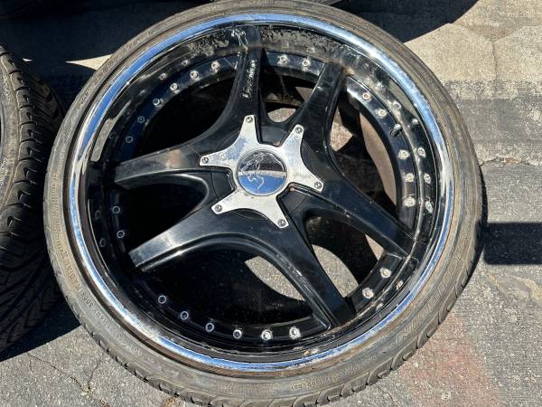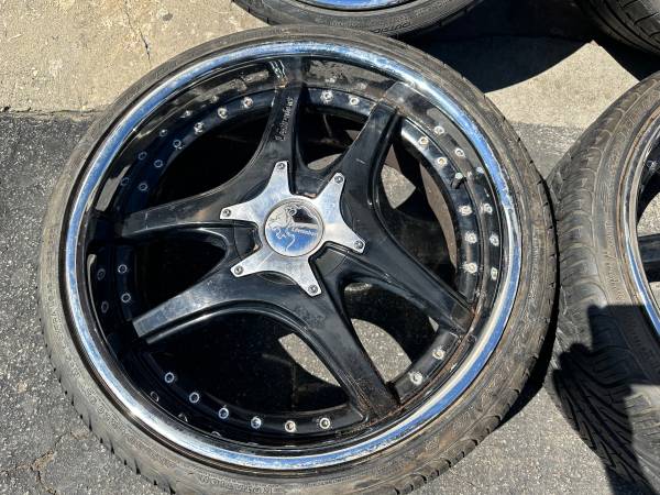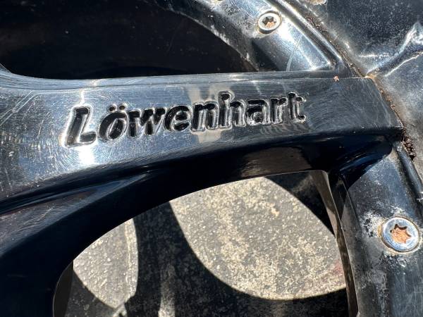 This is four 20 inch Lowenhart wheels from a Mercedes Benz. It’s hard to get an exact measurement with tires on then, but I believe The front rims are 20x9 inch and the rear are 20x11 inch (measuring between the rails where the tire bead actually sits. They have some very minor curb rash, and the chrome is pitted and starting to bubble on the lip. They still look good for a driver or could be refinished. They are not bent, cracked, or badly damaged.
