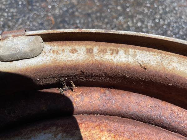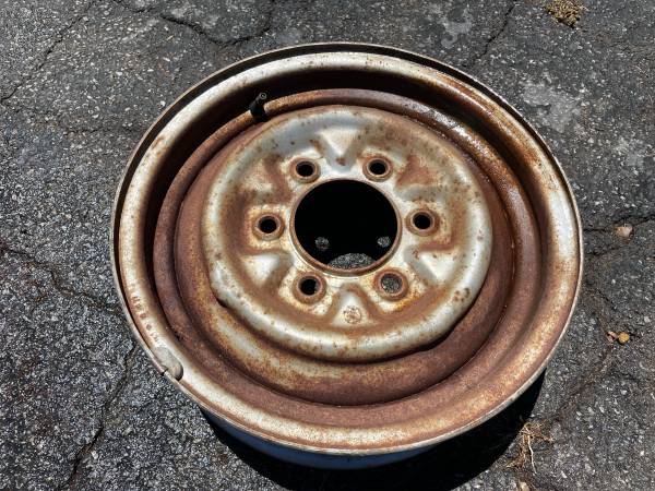 This is one single 14 x4.5 inch stock steel wheel. It has nubs to fit a dog dish style hubcap. I don’t know what it originally came on, but I’m sure it was a small pickup truck. The lug pattern is 6 on 5.5 inches which fits on a lot of minitrucks and other 6 lug classics.