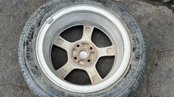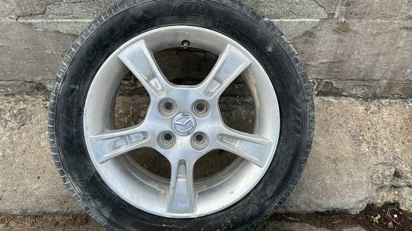 This is one 15x6 inch aluminum wheel orginally from a 2002 through 2003 Mazda Protege. The bolt pattern is 4 on 100 which will fit on other Mazda 4 lug vehicles such as Miata. The wheel is in good condtion no bends or cracks. The tire is old and needs to be replaced.
