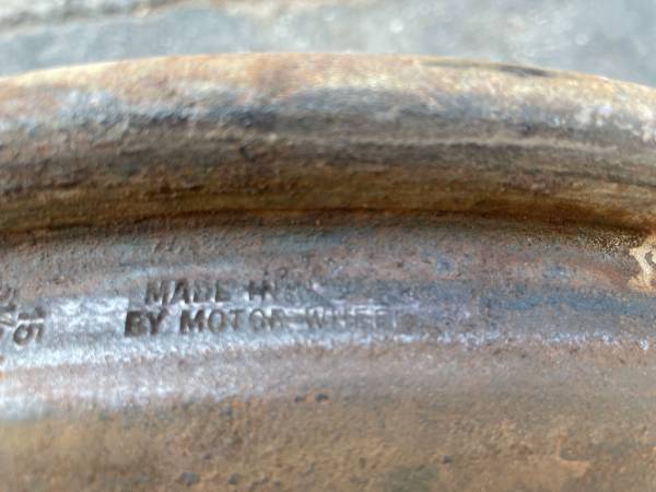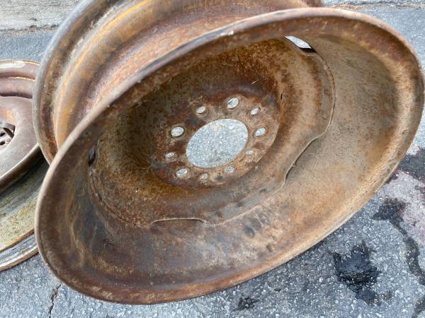 This is a single rim that was on a 1950s Buick. I don’t know if that’s what it’s originally from. This is an single steel rim which has the clips that hold on moon style center caps. This rim will not fit over disk brakes, drum brakes only. The lug pattern is 5 on 5 inches. This pattern fits on some full size cars like cadillac, buick, Oldsmobile, and pontiac from the 50s and 60s.