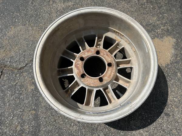 This is one 15x8.5 inch turbine style “Western wheel” that came off a classic Chevrolet c10 pickup truck. The holes are oblong and it will fit 5 on 5 inch or 5 on 4.75 inch lug patterns. This includes all Chevy and GMC 5 lug truck, van, or suburban, as well as almost all old Chevy, oldsmobile, buick, and pontiac, and cadillac cars and a few others.
