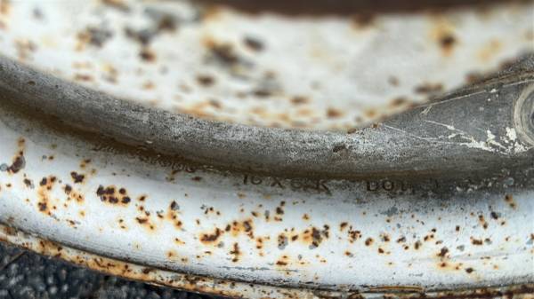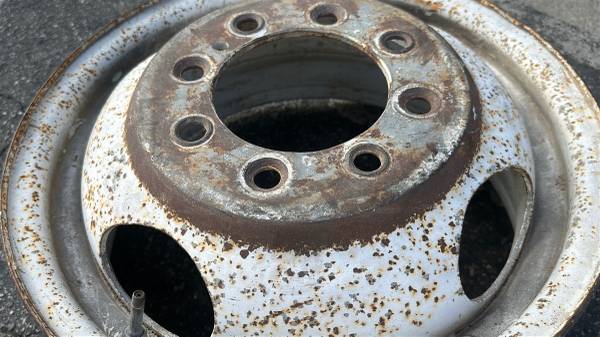 This listing is for one steel dually wheel, measuring 16 by 6 inches, that was removed from an old Dodge RV. The wheel features the heavy-duty 8 on 6.5 inch lug pattern and a large center bore of $4 \frac{7}{8}$ inches. This specific combination is a definite fit for older 8-lug Dodge and Chevy/GMC dually trucks, vans, and RVs, and it may also fit some Ford applications. This wheel has coined lug holes, meaning it requires the less common tapered-style lug nuts, and it is in good working condition with no bends or significant damage. It is perfect for use as a reliable replacement on any work truck, driver, commuter, or RV, although it could benefit from a new coat of paint.