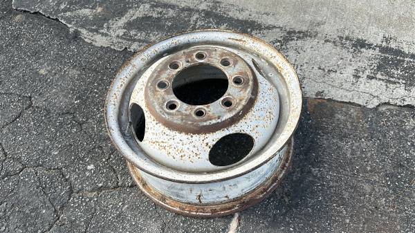 One 16 inch steel Dually with 8 on 6.5 inch coined lug holes fits - $100 (Montebello)