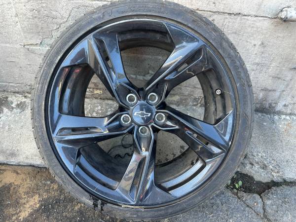 This is one 20 inch rim originally from the back of a 2019 through 2024 Chevrolet Camaro. It’s the back rim from a staggered set with 20x9.5 in the back. It’s an original GM black aluminum rim with a 5 on 120mm lug pattern. It will fit on any modern camaro as well as a few other Chevy and Pontiac cars. THEY DO NOT FIT TRUCKS. The tire is not good
