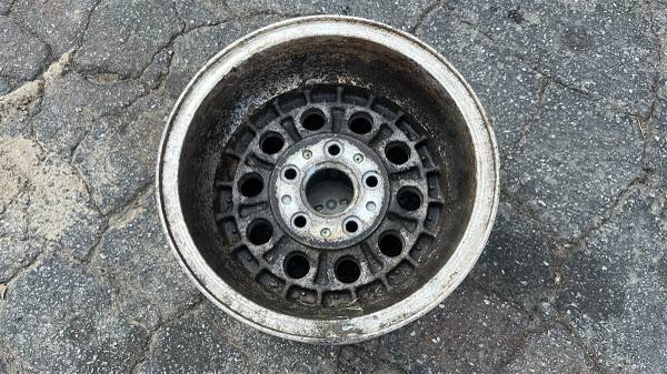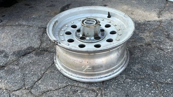This is one original 14-inch aluminum wheel from a 1990s Ford Ranger. The rim is in good condition with no bends, cracks, or damage, though the center cap is peeling. The 5 on 4.5 inch lug pattern fits many smaller Ford vehicles, as well as some Mazda, Toyota, and Honda models. Despite some scratches, the wheel is in good working condition. This wheel is perfect for a full-size spare or as a replacement for a damaged rim on a daily driver or work truck.