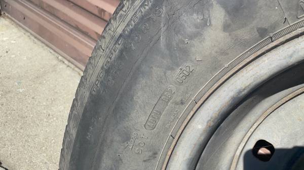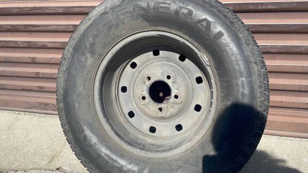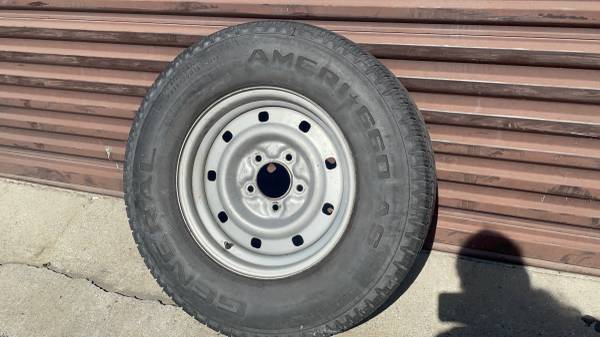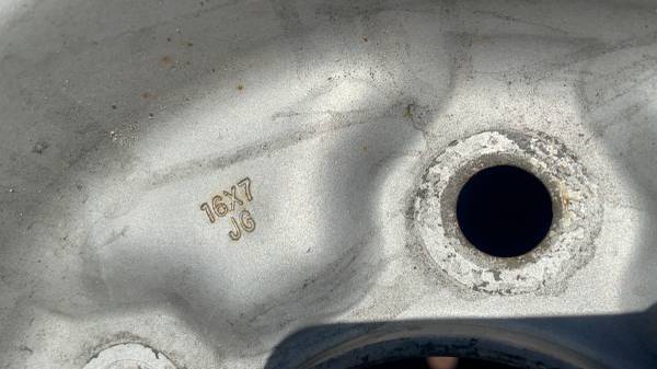 This is one 16x7 inch original factory stock steel wheel from a 1997-2003 Ford F-150 or Expedition. The rim is in good condition, looking as if it has been barely used, and it has the authentic Ford stamp. The 5 on 135 millimeter lug pattern only fits the F-150, Expedition, and possibly the Lincoln Navigator from those specific years. The tire is very old, with a 2002 date, and needs to be replaced, but it does hold air for temporary use. This full-size wheel is perfect for a spare, a replacement for a damaged rim, or for moving a vehicle around the yard.