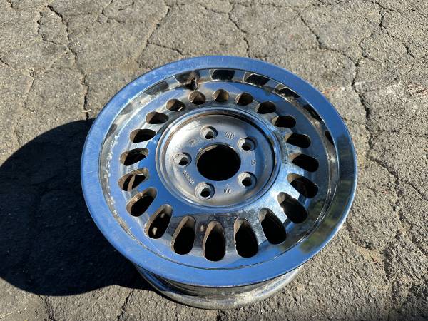 This is one single 15x7 inch teardrop style chromed Aluminum rim originally from a 1988 through 1992 Jaguar xj6. The rim is in good condition, it has no bends or cracks and looks good. There some minor chrome pitting on the edges, but it looks good for a driver.