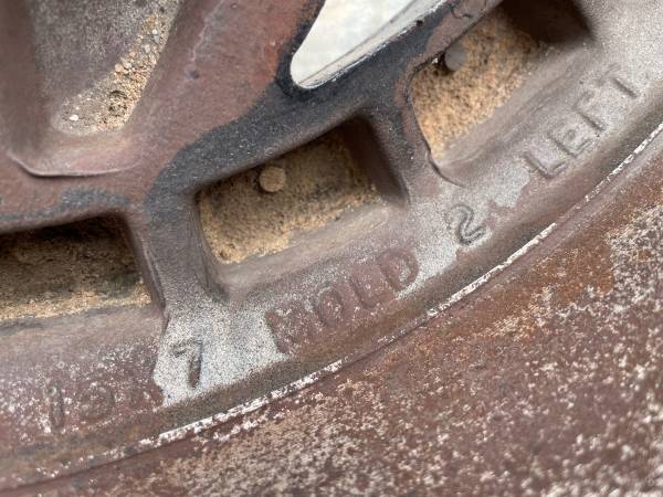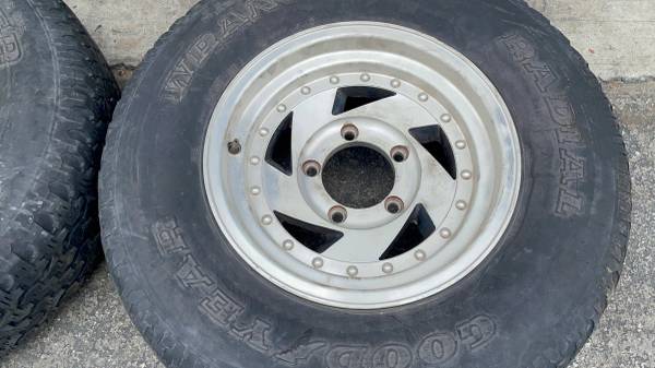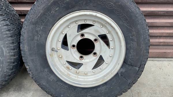 This is a set of four 15x7 inch sawblade style classic aluminum rims that came off of an old Ford F -150 pickup truck . The lug pattern is 5 on 5 .5 inches which will fit F -150 Bronco and Ford Vans from 1997 or older and also fits on some Dodge trucks Dodge Ram full -size 1500 trucks from the 90s. These have a large center bore so they will also fit old CJ model Jeep CJ5 CJ7 as well as some international harvester pickup trucks. The tires are bad and need to be changed. They're directional rims so there's two left side and two right side wheels and this is an original matching set In good condition no bends or cracks. I do not have the caps