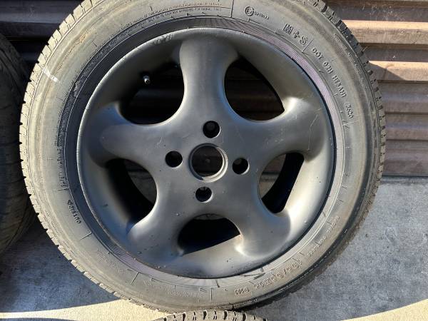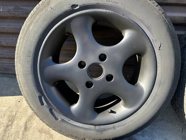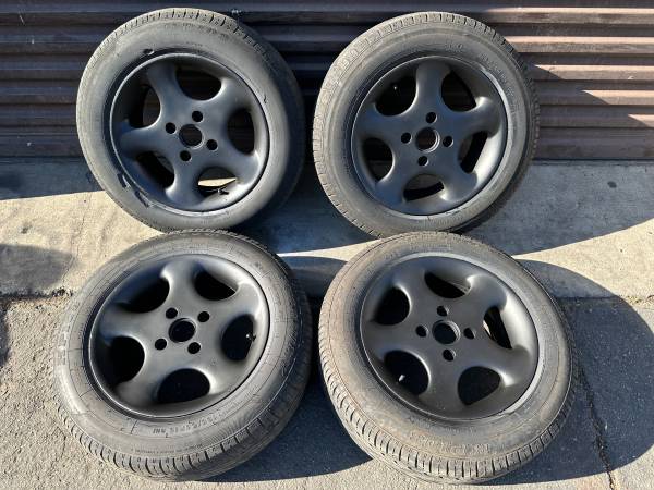 These are a set of four 15x7 inch Aluminum wheels that came off a Honda Accord. The lug pattern is 4 on 114.3mm (4.5 inches) which fits most 4 cylinder Accord cars as well as prelude and some Acura TL cars. There are many other cars with this lug pattern including some Nissan, Toyota, Mazda, Chevy, and more. The wheels are not perfect, but they are in good condition. They are spray painted black. They are not bent or cracked and there’s no major curb damage. They are stamped “Made in USA” on the back.