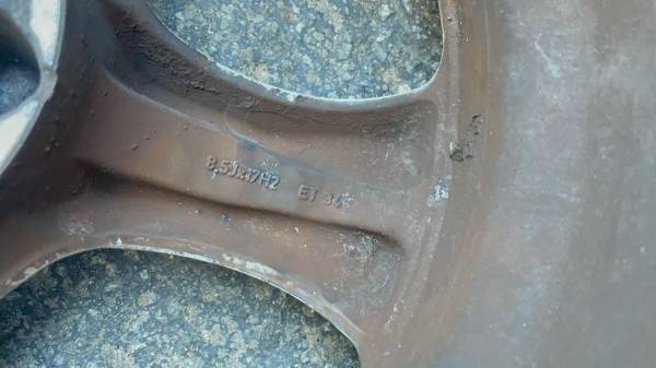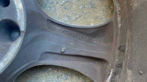This is a staggered set of four original aluminum wheels, likely from a Mercedes-Benz C-Class or CLK 320, which should fit many other Mercedes models. The front rims measure 17x 7.5 inches with an offset of ET 36, and the rear rims are wider at 17 x8.5 inches with an offset of ET 34. They feature the common Mercedes 5 on 112 millimeter lug pattern, offering a wide range of fitment possibilities. All four rims are in good structural condition, having no bends or cracks, though they are currently dirty and have some minor scuffs and scratches. The tires are not in good and will need to be replaced.