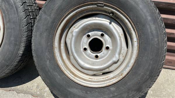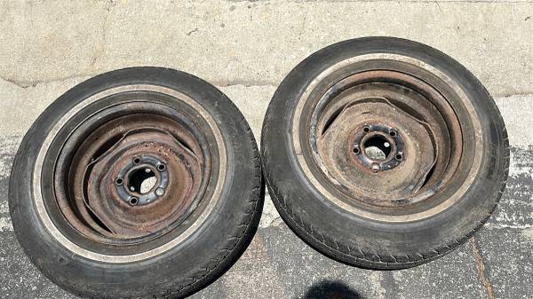 This is a matching pair of 14x6 inch stock steel wheels with a 5 on 4.75 inch lug pattern, likely from a G-body Chevy car or S10 pickup (letter code TX by valve stem). These wheels fit most Chevy and GM cars from the '50s through '80s, including Oldsmobile, Buick, and Pontiac models. They are compatible with both disc and drum brakes and originally came from a disc brake car. Both rims are in good working condition with no bends, cracks, or major damage. The tires currently mounted are very old and not safe for driving but can be used as rollers for moving a vehicle.