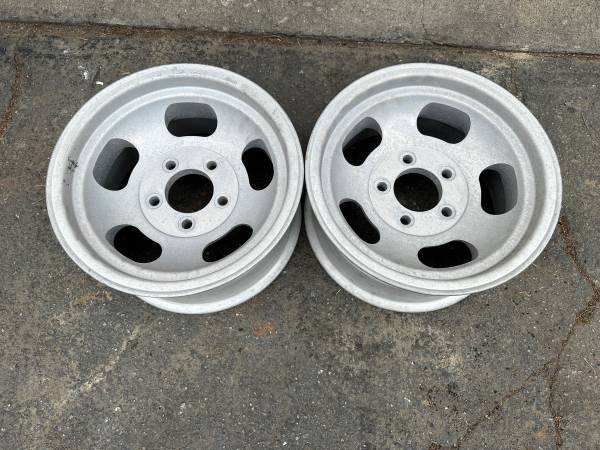 This is two 14 inch Mag slot wheels (also called drag slots) that were taken off of an old chevy car. They have a lug pattern of 5 on 4.75 inches. This fits most classic Chevy, Buick, Oldsmobile, and pontiac cars, as well as s10 or Sonoma trucks.