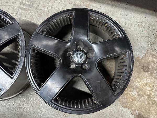 This is two 17x7 inch aluminum rims that originally came off an 01-05 Volkswagen Beetle car. They also fit a VW Golf. They fit 5 on 100 mm lug pattern. The wheels are in good condition with no bends, cracks or major damage. They are painted black.