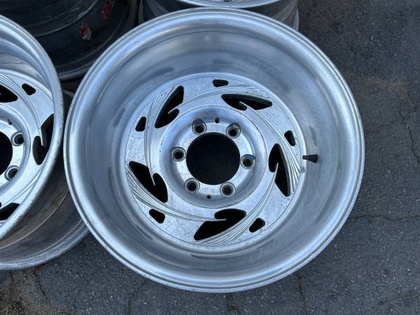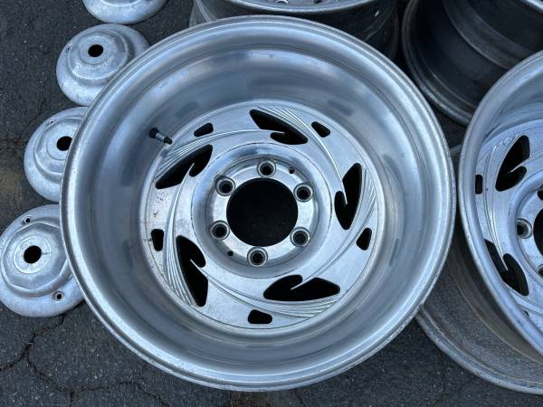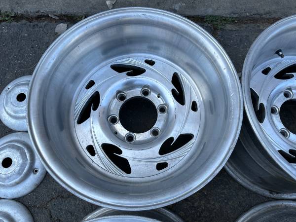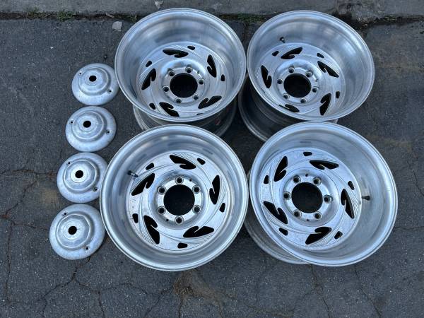 This is a set of four genuine Weld Scorpio 16x10 inch wheels and center caps. The lug pattern is 6 on 5.5 inches which fits most 6 lug trucks and vans. They will fit Toyota, Chevy, GMC, Cadillac, Nissan, Isuzu, Mazda, Mitsubishi, and many others. The rims are in good shape, they have no curb rash or damage. They could use a Polish, but they are not bent, cracked, or beat up. They come with all four of the original aluminum center caps. The emblems are missing, but that’s easy to replace. Because they are 10 inches wide you could mount any big 4x4 tires on them, or use very wide street tires on your hot rod or mini truck. They will fit on classic trucks as well as many modern trucks.