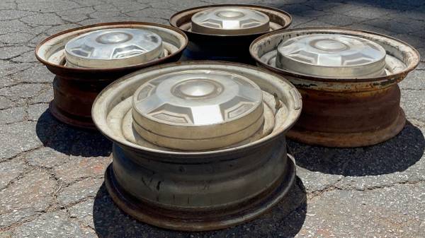 White Patina 15 inch Ford F-100 steel wheels with dog dish caps - $400 (montebello)