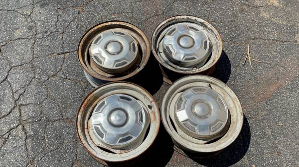 This is a classic set of four 15 inch stock steel Ford truck rims with dog dish center caps from a Ford F -150 or F -100 pickup truck The lug pattern is five on 5 .5 inches, which also fits on Ford vans and Ford Bronco as well Any full -size five lug Ford from 1997 or older The rims are all in good condition. They have original white paint with some minor surface rust and patina. One of them looks like it may have been repainted at some point. The other three I believe are all original paint. Also one of them is slightly narrower by about half an inch. It's hard to tell but it is there if that matters. All four rims are in good working condition with no bends, no cracks, no major damage on any of them anywhere. Perfect for any daily driver, commuter, restoration, rat rod, etc.