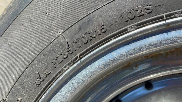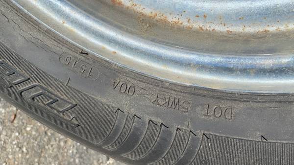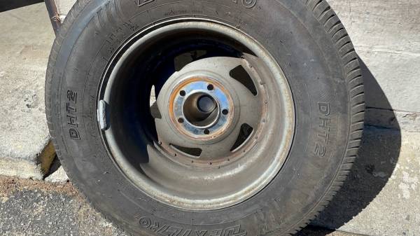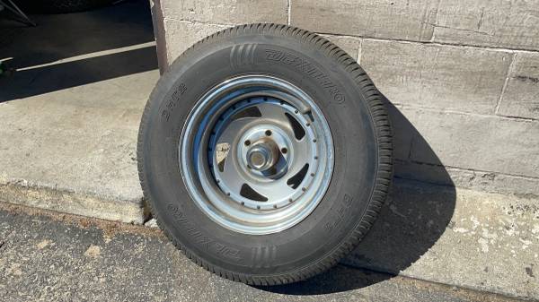 This is one single 15x8 inch chrome steel sawblade style rim that includes its original center cap. The wheel is in good working condition with only minor surface rust, showing no bends, cracks, or major damage. The 5 on 4.5 inch lug pattern is a very common size, fitting many Ford, Chrysler, and Jeep vehicles, though the 8-inch width might require checking backspacing for some applications like trailers. The mounted tire holds air, but its 2015 DOT date means it is 10 years old and must be replaced immediately. This wheel is perfect as a spare or a direct replacement for a damaged wheel on a work truck or daily driver.