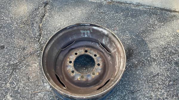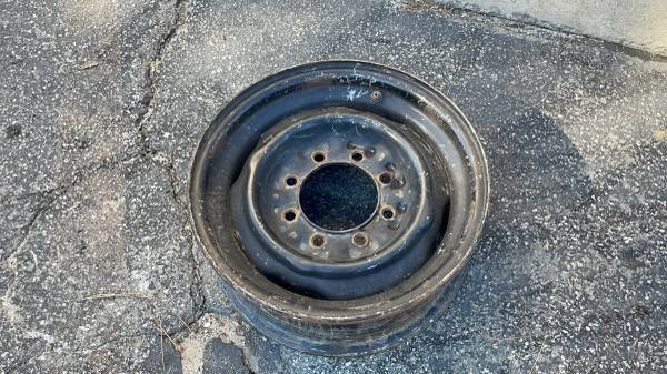This listing is for one original factory Ford steel rim, measuring 16 by 6 inches, that came from a Ford Econoline van. The wheel features the heavy-duty 8 on 6.5-inch lug pattern and a large 4- and 7/8-inch center bore. This bolt pattern is compatible with older 8-lug Ford, Chevy, and Dodge trucks from the 1990s or older. Importantly, this rim will fit newer Ford vans all the way up to the current model year. The rim is in good working condition, having no bends, cracks, or damage, making it a reliable spare or replacement.