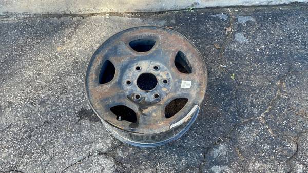 This listing is for one original factory GM steel wheel, 16 inches in diameter, that would be perfect as a spare tire. The wheel features the 6 on 5.5 inch lug pattern with the smaller center bore, which restricts fitment to GM vehicles only (it will not fit Toyota, Nissan, or other makes). This rim is the correct fitment for most 6-lug Chevrolet or GMC trucks and SUVs, including the Silverado, Sierra, Tahoe, Suburban, Yukon, and compatible vans. The rim is in good working condition, having no bends, cracks, or significant damage, though it does show a little surface rust.