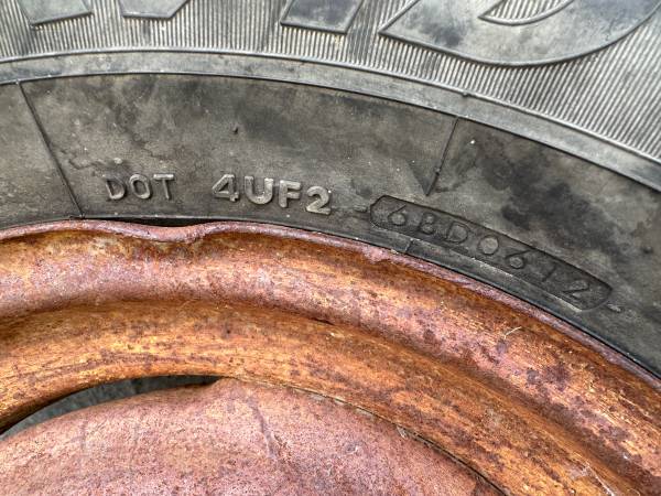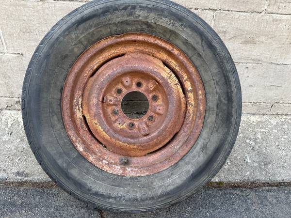 This is one 16 inch steel rim from a 40s or 50s Chevy truck. This is the three clip style rim which fits moon style hub caps. This rim has a couple bends on the lip, but it’s still holding air. The tire is old, and not really the correct size for the rim. You could use it as a spare or roller, but it needs a new tire if you’re going to drive on the street.