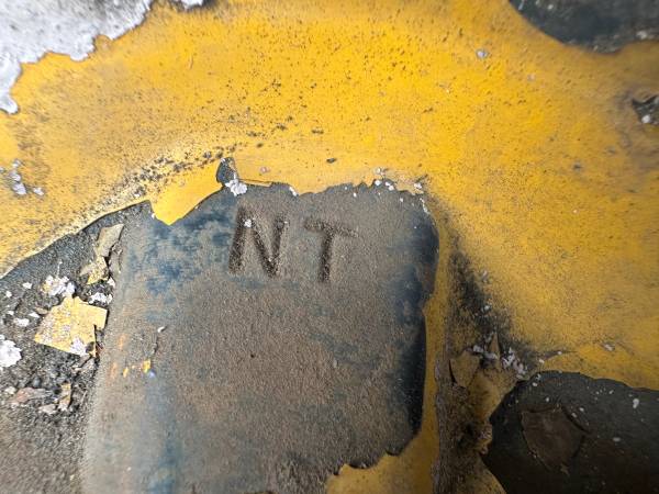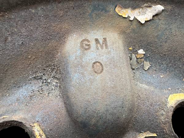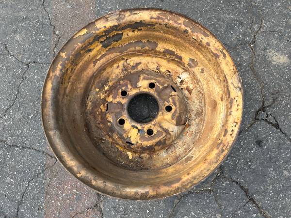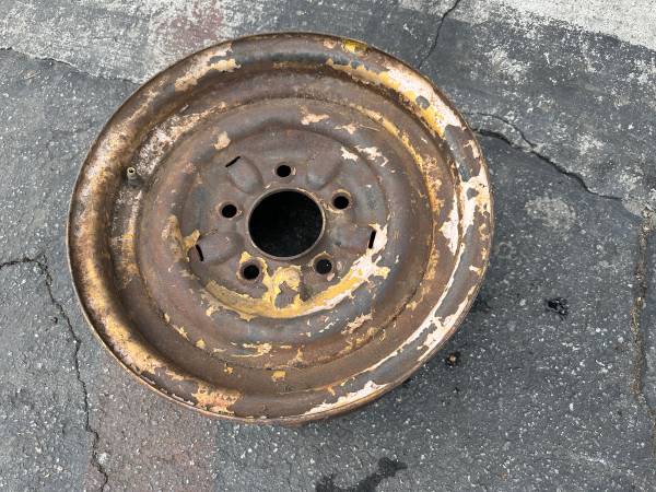 This is a single rim that was on a 1950s Oldsmobile. I don’t know if that’s what it’s originally from, but it has a GM stamp and says “made in USA” This wheel has the slots for three spring clips that hold on moon style center caps. This rim will not fit over disk brakes, drum brakes only. The lug pattern is 5 on 5 inches. This pattern fits on some full size cars like cadillac, buick, Oldsmobile, and pontiac from the 50s and 60s.
