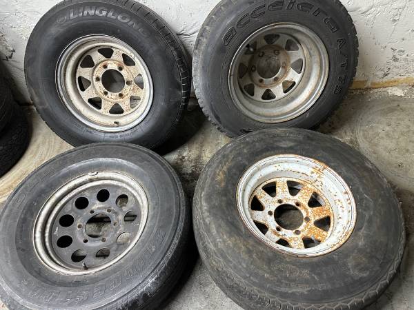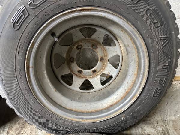 This is four mismatched 15 inch steel rims with old tires that came off a Chevrolet k5 4x4 truck. They are all mismatched wheels. Different sizes, styles, and colors. These are perfect if you’re sending your truck to the junkyard or the paint shop and just need it to roll around. The lug pattern is 6 on 5.5 inches which fits most classic 6 lug trucks and vans. They will fit Chevy, GMC, Nissan, Isuzu, and many others.