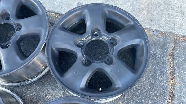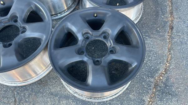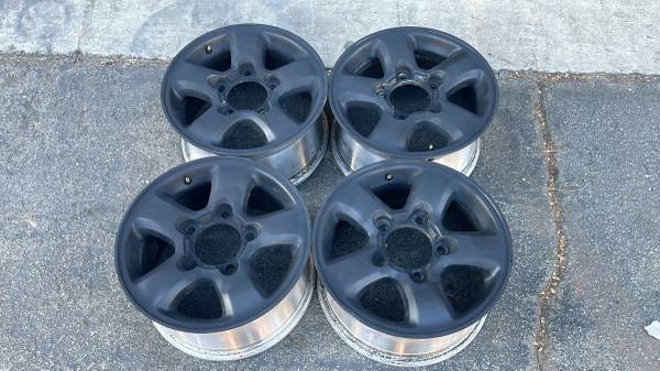 This is a set of four 16x8 inch factory aluminum wheels originally from a 1998 through 2002 Toyota Land Cruiser. The lug pattern is 5 on 150mm which is a large 5 lug pattern. It does not fit on any of the smaller Toyota pickups. It only fits on the Land Cruiser or the Lexus equivalent of the Land Cruiser. They do not fit on any other SUVs or pickups. 5 on 150mm is a pretty rare lug pattern. All four rims are in good condition with no bends, cracks, no major damage on them. They're spray painted black and it's not perfect, but it looks pretty good. Perfect for any project, daily driver, commuter, et cetera.