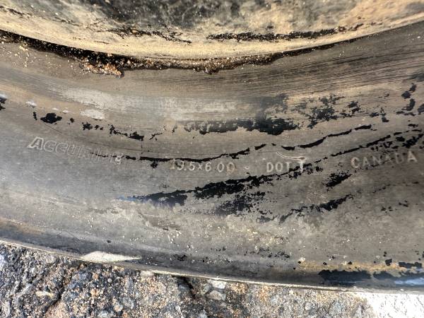This is two matching 19.5x6 inch Accuride steel dually wheels from a Chevy p30 step van. The rims are in good shape. They have some minor dings and curb damage, but they are not bent or cracked, and they look good.