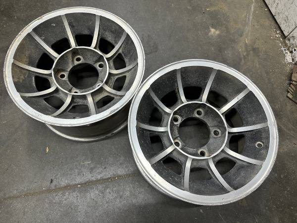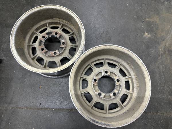This is two “American racing” vector style 15 inch aluminum rims. The lug pattern of the rim is 5 on 5.5 inches, which will fit on all CJ model Jeeps, All ford F100, F150, and Bronco from before 1996, most dodge trucks from the 90s, and also International, Scout, Tracker, and more.