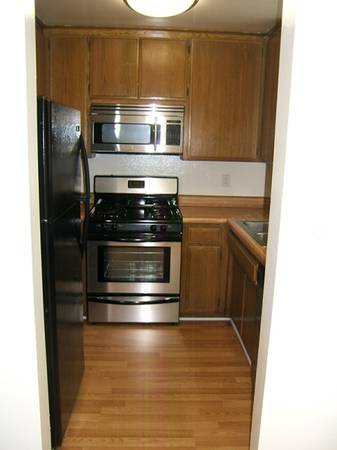 Lower unit with laminates throughout, gas fireplace, air conditioning, french doors opening to a balcony. The kitchen has a dishwasher, microwave, gas stove & refrigerator. .