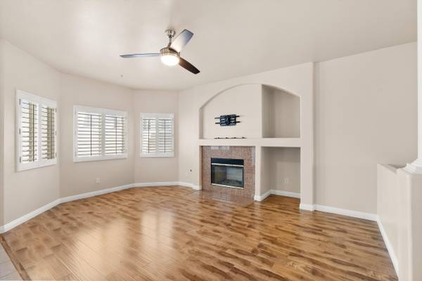 The home features pristine laminate wood-style flooring, crown and base moldings, custom shutters, and recessed lighting throughout. The kitchen includes granite countertops, travertine floors, a center island, and newer stainless steel appliances, opening to a cozy family room with a gas fireplace.