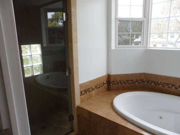 Upstairs are 2 huge primary suites, each with private bathroom and huge walk-in closet. Larger suite has the most beautiful bath with separate steam shower and huge sit down bath overlooking the yard. A private balcony is shared by these two bedrooms and has a peek-a-boo ocean view.