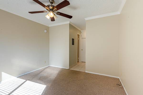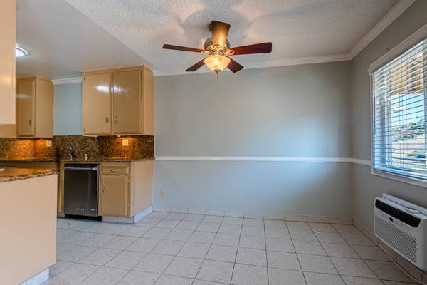 This unit features fresh new paint, spacious living and bedroom areas, ceiling fans, a large private balcony, and a mix of hardwood floors and carpet. The kitchen comes equipped with a cooktop, wall oven, and dishwasher.