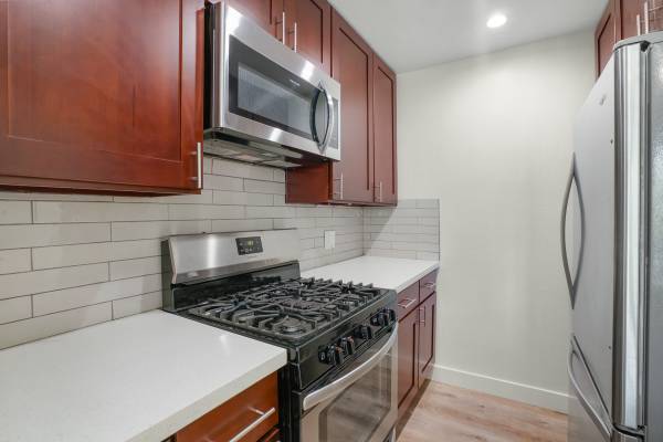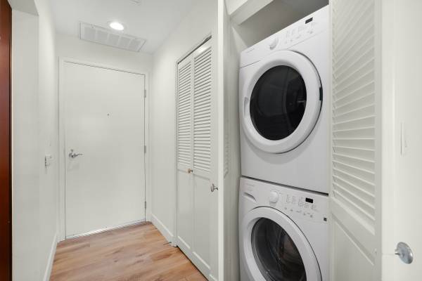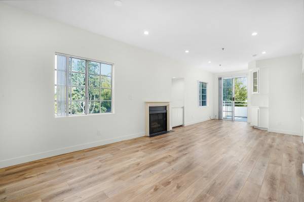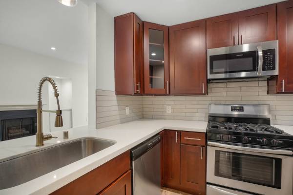 This top one bedroom penthouse apartment home has central air, a private balcony, in-unit washer/dryer, a gas fireplace, and laminate wood flooring. Kitchen is equipped with modern appliances including a refrigerator, a gas stove/oven, a microwave and a dishwasher.