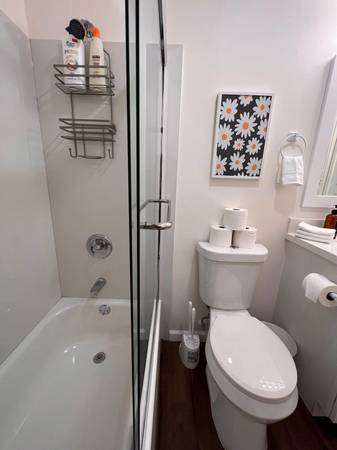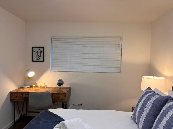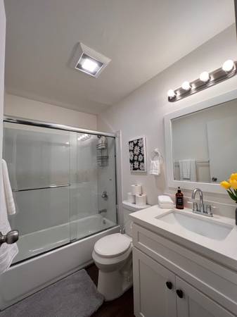 Very spacious and fully remodeled upper level 1br + 1ba with two sinks, high end LG washer dryer in unit, new kitchen with microwave, refrigerator, and dishwasher all included. 1 garage parking space with locked private large storage unit in laundry room. Bedroom has two large walk in closets. New windows as well. A/C in living room and I use a portable one in the bedroom very rarely.