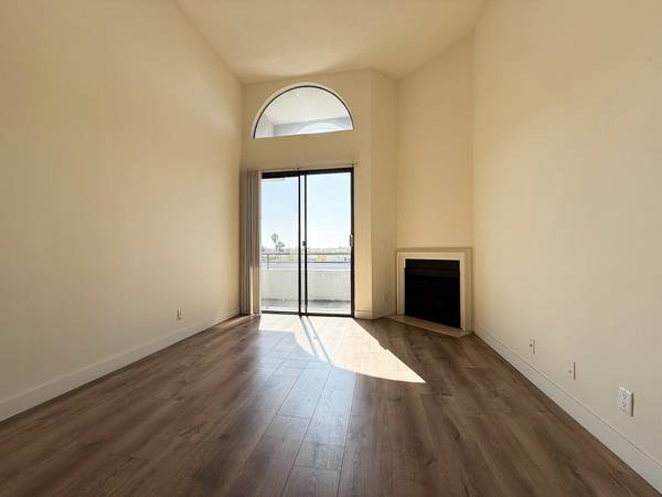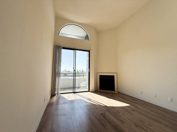 Westwood top floor 1 bedroom 1 bath penthouse apartment features extra-high ceilings, a cozy fireplace, and a private balcony.