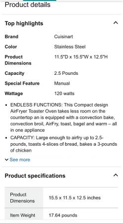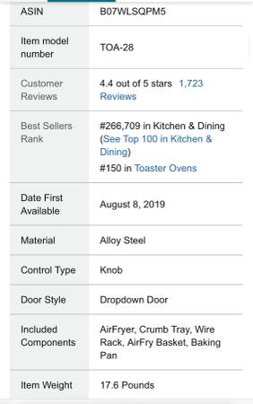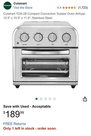 This is a Cuisinart TOA – 28 in very good condition. It is mostly used for the air fryer function, but it has more than eight functions. See the photos for all the dimensions and specifications. I...
