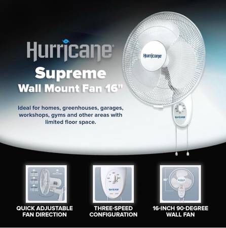 Mint condition! Barely used. This is the best known brand and model for wall mounted fans. Hurricane Supreme. I have two of them for sale, $20 each.