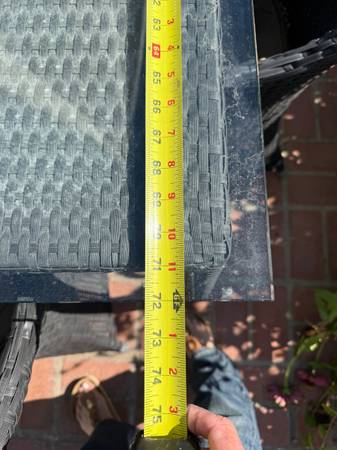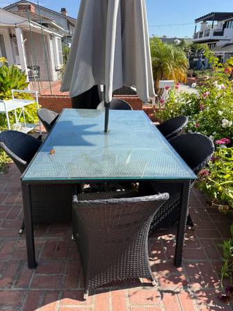 Outdoor dining set = table & six chairs (umbrella not included) durable plastic rattan. Pick up only