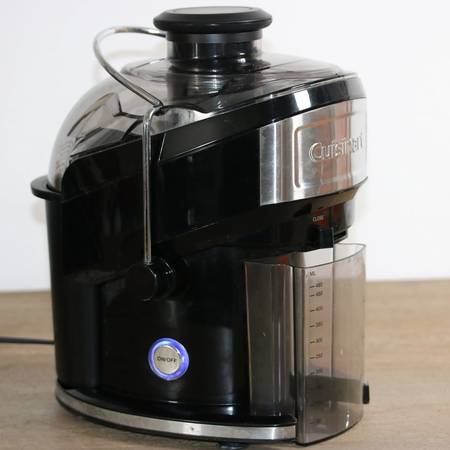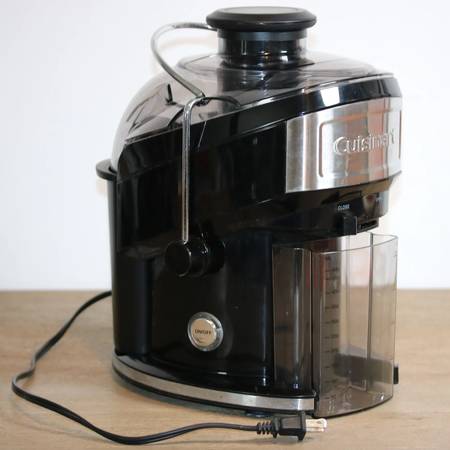 Compact and efficient Cuisinart juice extractor in working condition. Features stainless steel design, safety locking arm, and 16oz juice container.