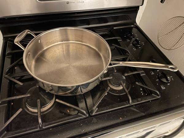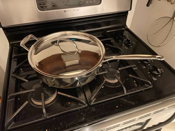 Stainless steel 5 1/2 quart 12" x 3" Sauté Pan. Very clean, lightly used. Big.