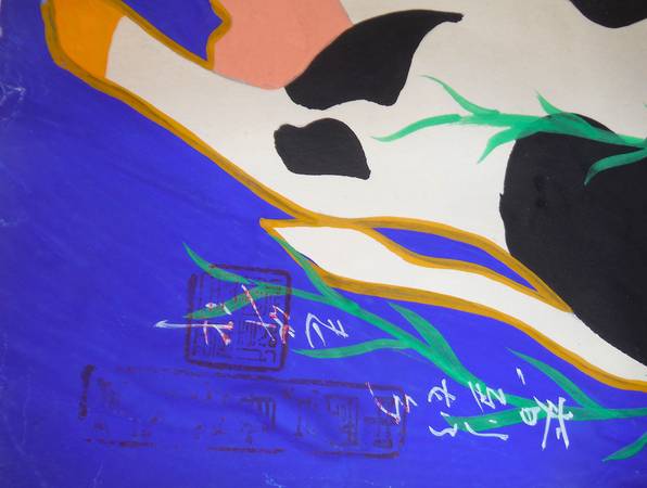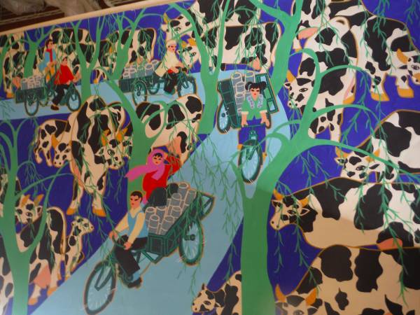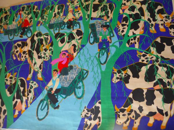 Street Scene Painting of Rider on 3 Wheel Bicycles with Food Supplies and Cows along the Road Side