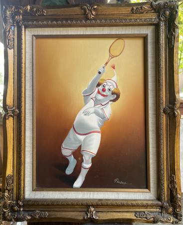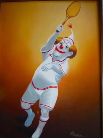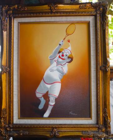 Original Vintage Painting of Happy Clown ~ Playing Tennis or Badminton