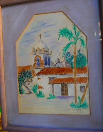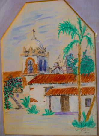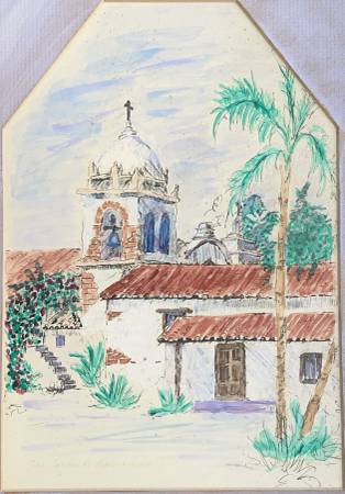 San Carlos Borromeo Mission Town - Watercolor and Pen Drawing - Original Vintage - Antique