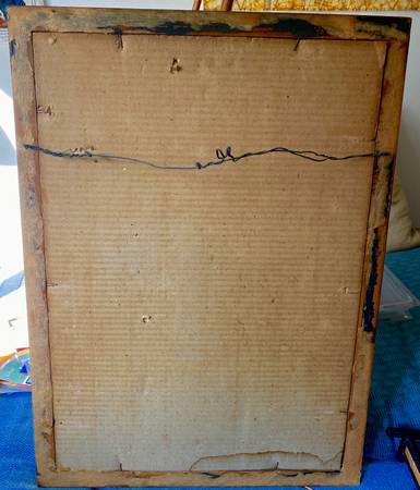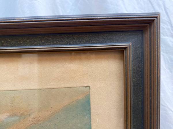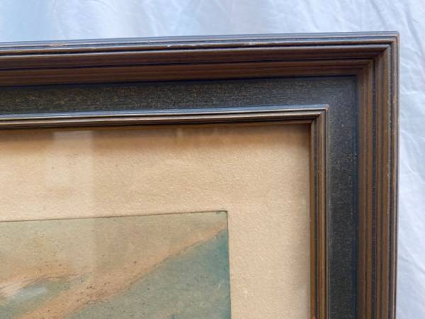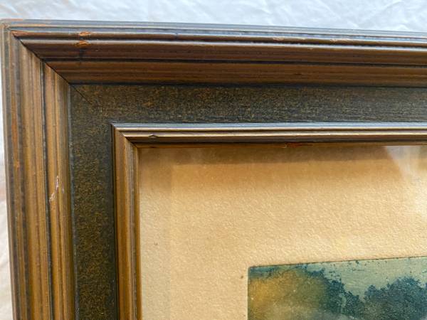 Dark brown and gold wood frame. In excellent condition; no gouges, no nicks, nothing to repair. Has the wire mounting intact in the back. So hanging it will be a breeze.