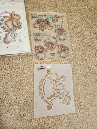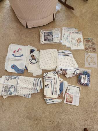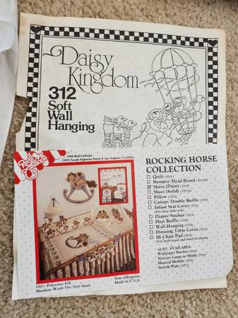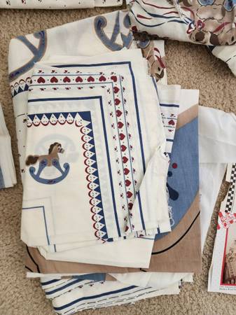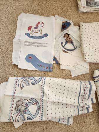 Fabric Band Iron-On Rocking Horse Collection Bundle. Price listed is total for everything. Comes with fabric, iron on stencils, and crib hanging. Also throwing in the wallpaper border. Machine...