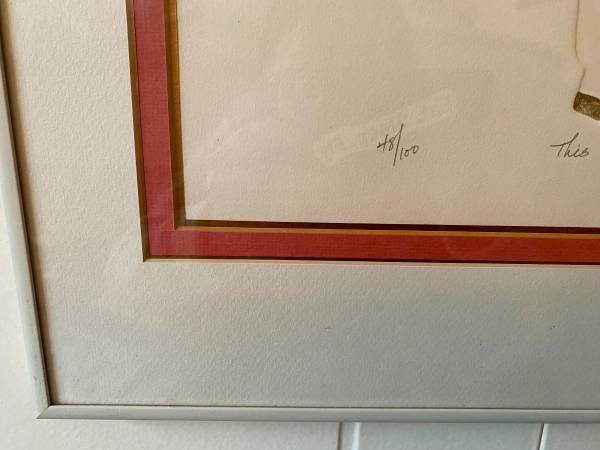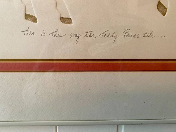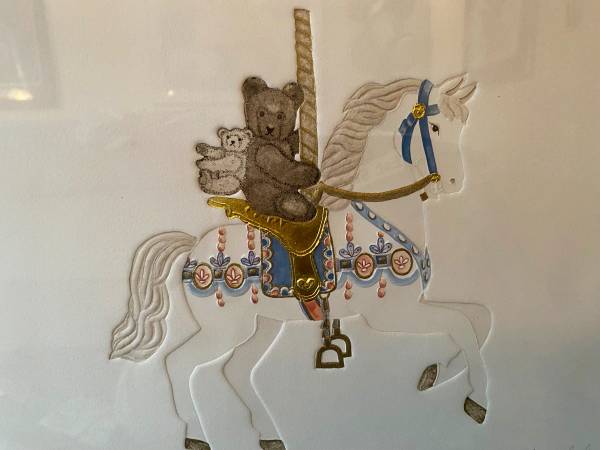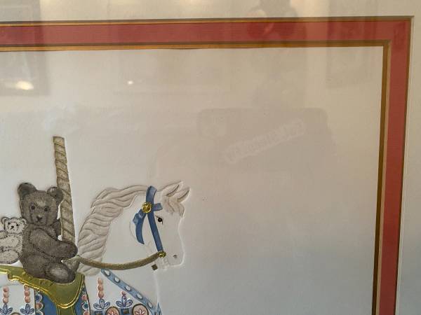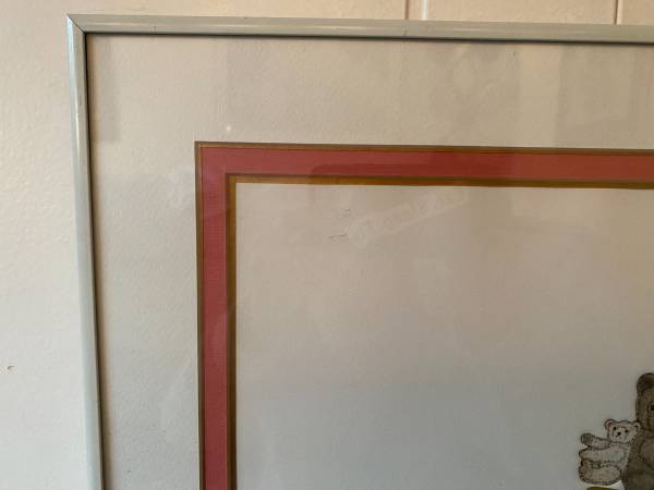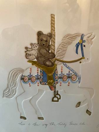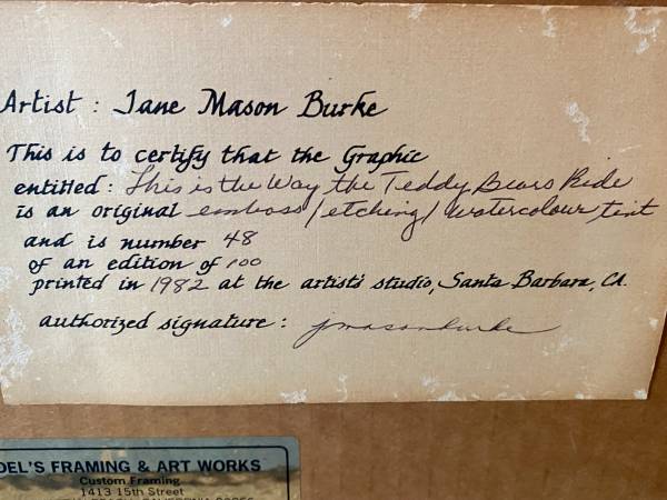 From Grammas collection of wall art, we have a Joan Burke (American, 20th Century) graphic in lively water colors on white paper, etched and embossed. The graphic is signed, numbered 48/100 , and titled in pencil along lower edge This is the way the Teddy Bears Ride. Signed by the artist. Circa 1982. It is professionally framed and matted. It has the feel of "I can relax. Everything is safe. All is well". Makes a perfect gift for any occasion.