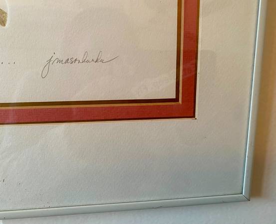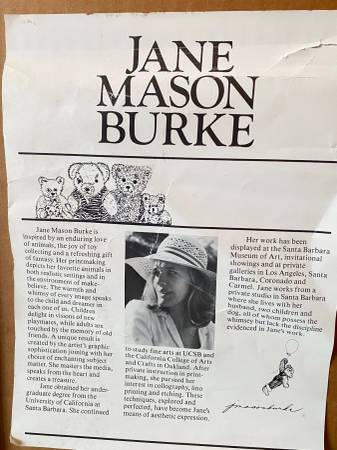 What you keep seeing on your walls becomes a part of your vibration. This etching/ embossed/ watercolor graphic by Jane Mason Burke of Santa Barbara evokes a mood of happy contentment and joyous innocence. Great wall art for a little child's bedroom, salon or massage spa. The etching is in pristine condition; it has full certification in the back of the frame together with notes on the artist and gallery it was purchased from.