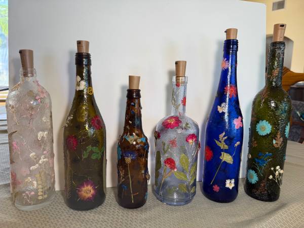 great gift idea - pressed flower decoupaged wine bottles - $35 (Westwood)